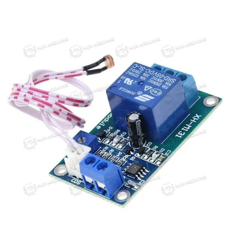 Модуль реле 12В с датчиком света XH-M131 применяется в проектах на базе Ардуино, связанных с настройкой уровня освещенности: автоматическое включение света, увеличение яркости подсветки телефона, активация фар автомобиля. Модуль срабатывает при достижении определённой интенсивности света. Измерения выполняются при помощи встроенного датчика XH-M131. Сравнение полученной интенсивности света с пороговым значением производит компаратор. Пороговые значения можно задать с помощью подстроечного резистора. На плате есть два модуля для подключения к контроллеру, а также два индикаторных светодиода.